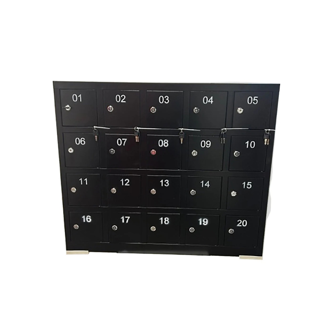 Detta förvaringsskåp för mobiltelefoner är en smidig och säker lösning för att organisera och förvara upp till 20 enheter. Skåpet är utrustat med 20 separata fack, där varje mobil har sin egen plats bakom en individuell lucka. Varje fack låses med egen nyckel, vilket ger hög säkerhet och gör det enkelt att hantera åtkomst för olika användare. Samtliga fack är dessutom tydligt numrerade, vilket underlättar både administration och ordning i miljöer där flera personer använder skåpet.