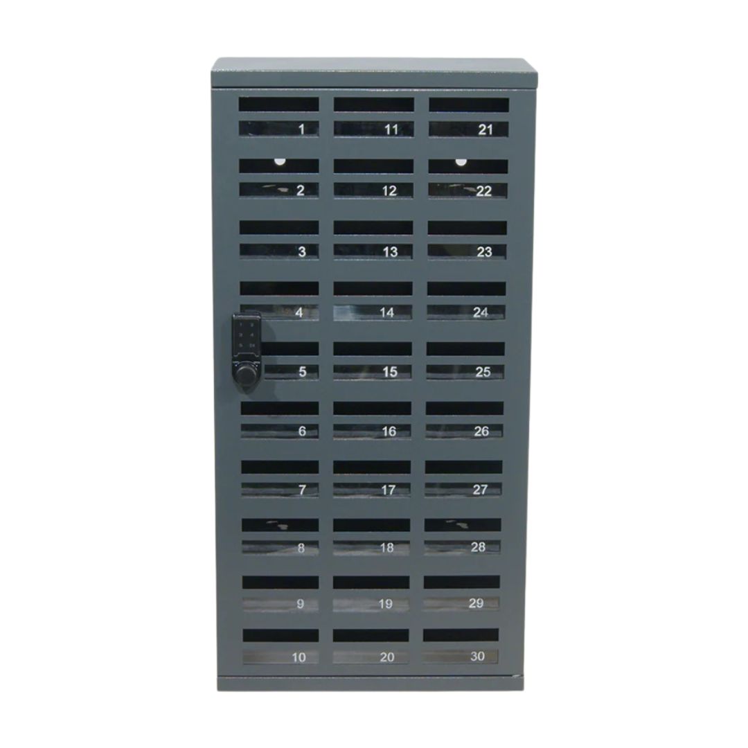 Praktiskt och säkert förvaringsskåp för mobiltelefoner med plats för upp till 30 enheter. Varje fack är utrustat med en egen inkastlucka, vilket gör det möjligt att lämna in telefoner även när skåpet är låst.